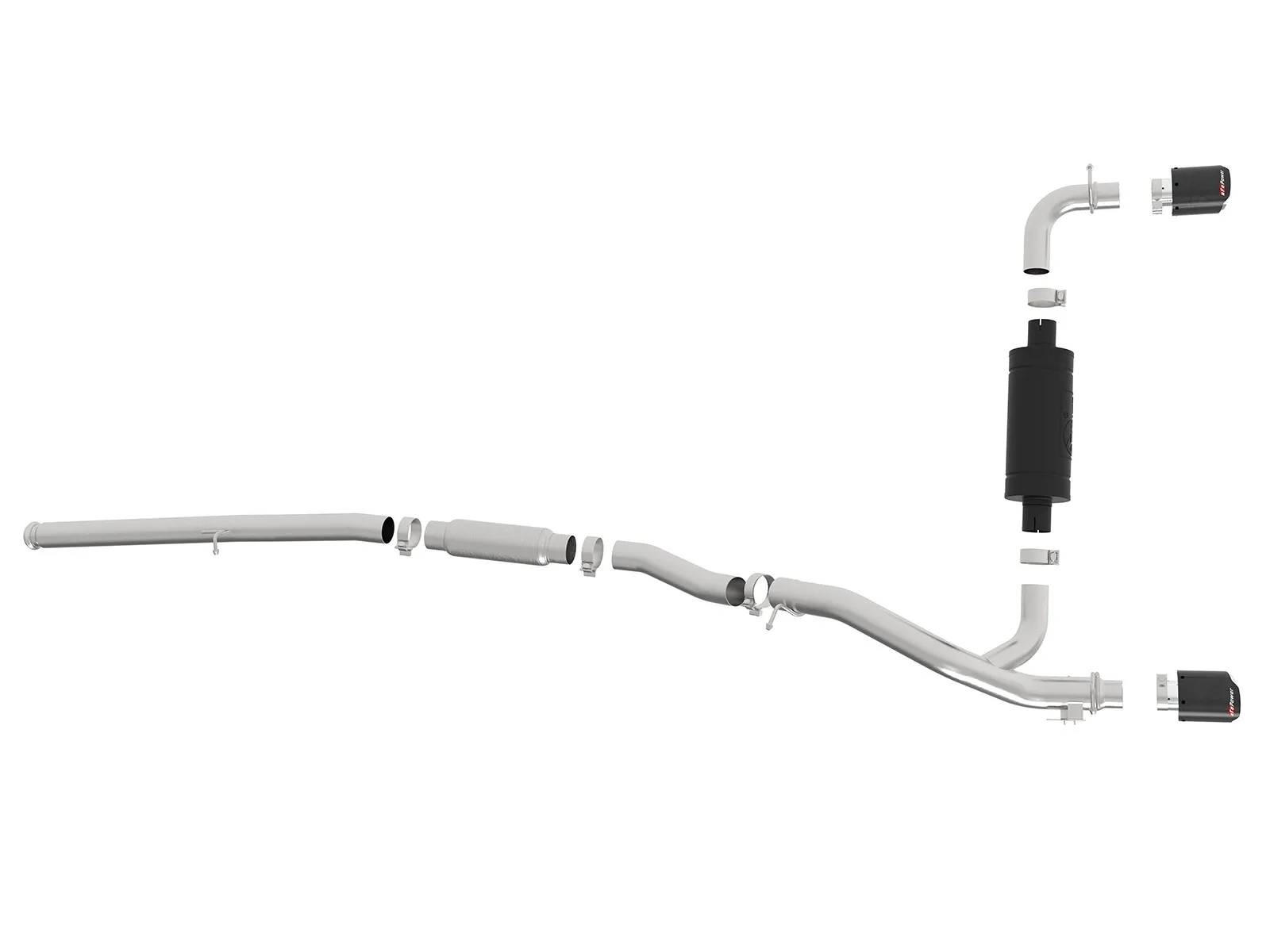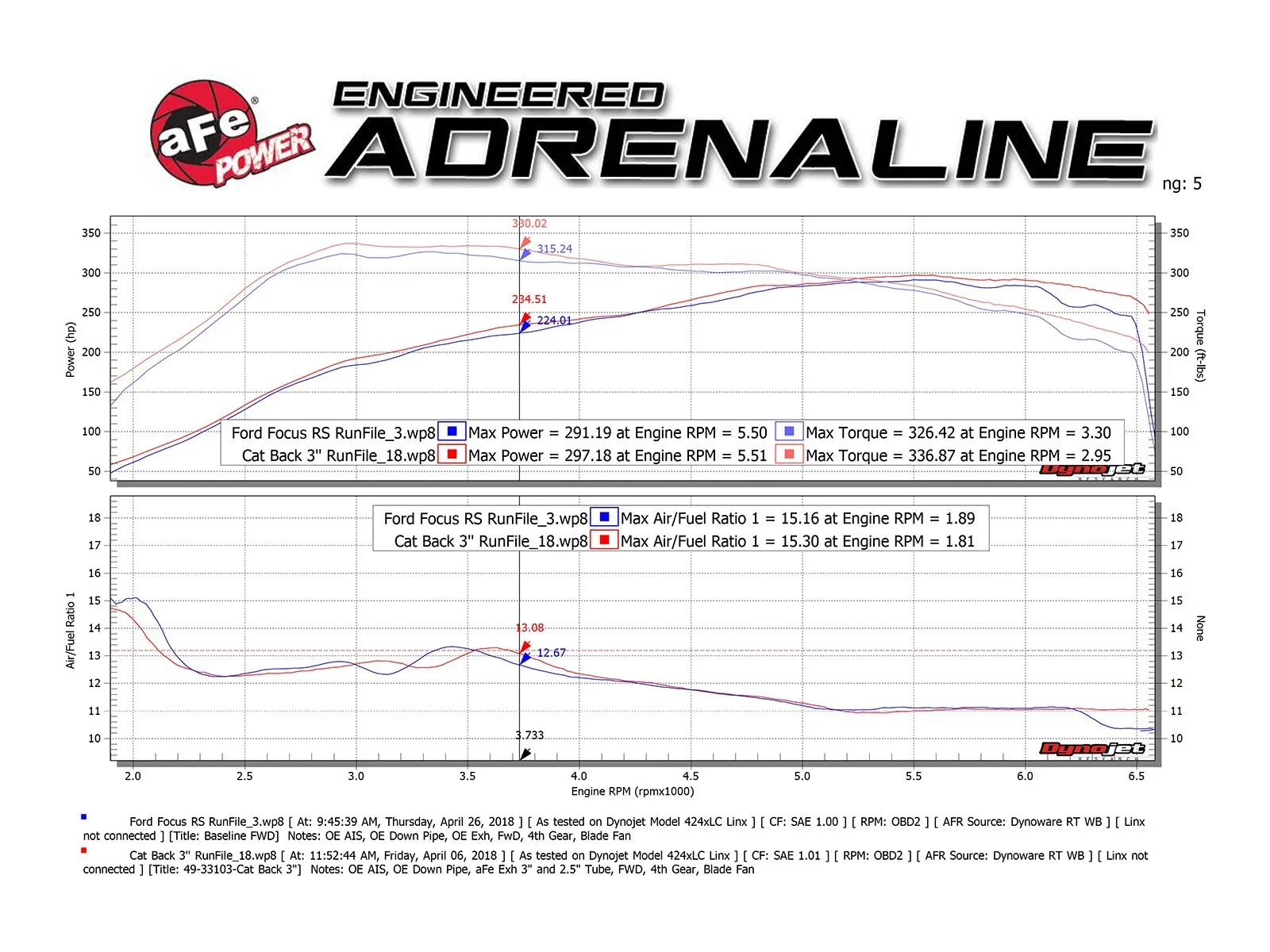 Submit A RequestPower, sound and good looks is what this Takeda cat-back exhaust delivers. Power gains of up to +11 horsepower and +15 lbs. x ft. torque as shown on our in-house dyno. 3"- 2-1/2" mandrel bent 304 stainless steel tubing and high flow transverse muffler offers maximum exhaust flow and incorporates a factory style exhaust valve to control the exhaust note. The valve utilizes the factory valve motor and factory performance modes. When closed, it directs the exhaust through the high flow muffler for a smooth, tuned exhaust note. When opened, the exhaust is allowed to bypass the muffler and unleash the sound and performance of your RS. The high flow, stainless steel muffler is finished in high temp, metallic black powder coating for long lasting good looks. Dual 4 1/2" black stainless steel exhaust tips with laser etched Takeda brand logo for a custom finish.