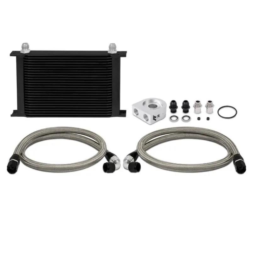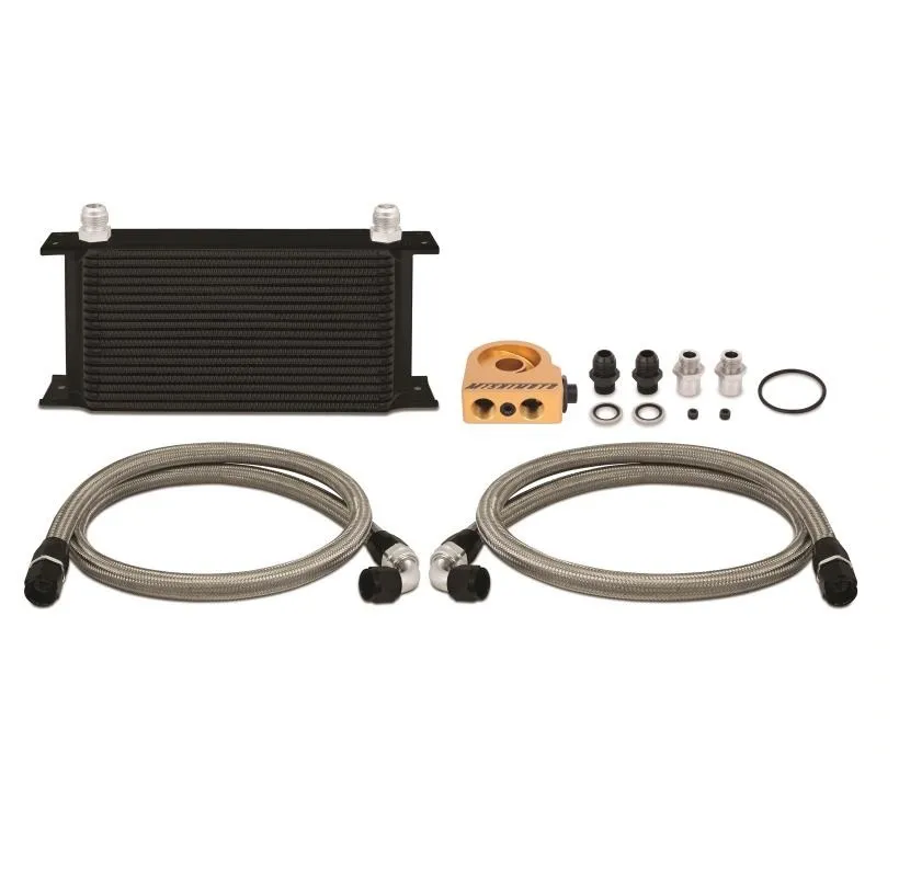 Proper oil temperature regulation is key to extending and preserving the life of your stock or high performance engine. Keep your temperatures in check with the Mishimoto universal oil cooler kit. This kit is applicable for most vehicles and includes all key components for reducing oil temperatures and providing your engine with extra protection against oil degradation. This kit includes a billet anodized aluminium sandwich plate in either standard or thermostatic form. The optional Mishimoto thermostatic sandwich plate provides additional temperature control and will limit oil flow to the cooler until optimal temperatures are reached, making it ideal for those in cooler climates. The included core is our proven Mishimoto 19 row stacked plate cooler which can withstand high fluid pressures and significantly reduce oil temperatures while exhibiting minimal pressure loss. This kit includes both a -16 and M20-1.5 sandwich plate adapter which supports fitment for most makes and models. This kit also includes pre-assembled stainless steel braided oil lines with -10AN fittings and dowty seals for durable, leak free connections. Whether you are piloting a boosted rotary or blown small block the Mishimoto universal oil cooler kit will provide the efficiency you need to stay on the track and out of the shop. As with all our products this kit includes the Mishimoto Lifetime Warranty